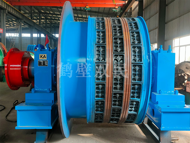 這臺多繩摩擦式提升機為,鶴壁市雙民礦機生產的落地式多繩摩擦式提升機,型號為:JKMD-2.8×4PI 多繩摩擦式提升機。