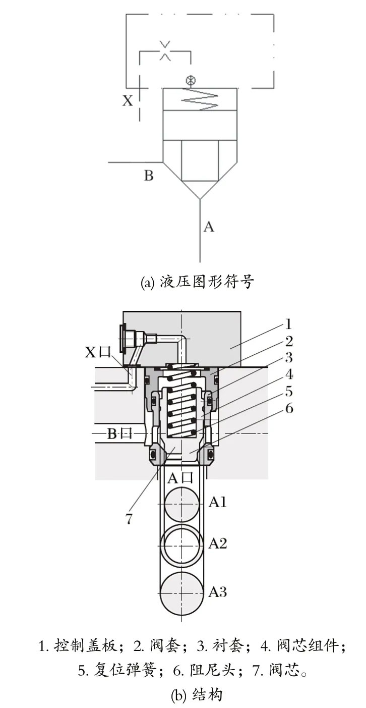 3.1 二通插裝閥 二通插裝閥由插裝組件、控制蓋板等組成。插裝組件安裝于油路塊中符合 ISO 7368 的標(biāo)準(zhǔn)安裝孔中,并用控制蓋板封嚴(yán)。通過插裝組件,控制蓋板和其他附件的組合可以實現(xiàn)需要的控制功能。二通插裝閥具有流動阻力小、通流能力大、動作速度快、抗污染能力強(qiáng)、工作可靠、結(jié)構(gòu)簡單、易于實現(xiàn)元件和系統(tǒng)的“三化”、簡化系統(tǒng)等優(yōu)點。