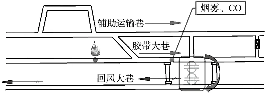當開拓大巷某一地點發生火災等事故時,由于明火存在火風壓,在自然通風條件下,明火與有毒有害氣體會隨風流向下游區域蔓延。為準確監測災變后的氣體特征,需要安裝煙霧和 CO 報警傳感器。當監測氣樣指標超限時,系統自動打開膠回聯巷處的 2 道風門,實現局部巷道的風流短路,改變供風方向,切斷向下游蔓延的氣體擴散通道,從而達到保護下風側作業人員生命安全的效果。風流短路調控路線如圖5所示。