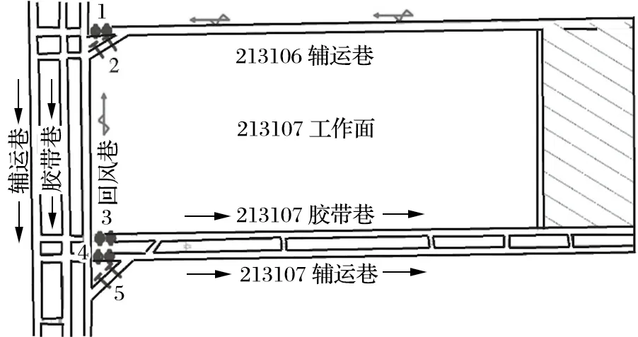 以213107 工作面為例,分別在 213106 輔運巷安裝 2 道風門,213107 膠帶巷安裝 1 道風門,在 213107輔運巷及專回各安裝 1 道風門。采煤工作面風流優化系統如圖4 所示。其中編號 1、3、4 為自吸風門;編號 2、5 為自調節風門。正常通風時,打開 2、3、4 等風門,形成 U 形全負壓通風,關閉 1、5 風門形成閉合回路;發生災變需要反風時,則打開關閉的 1、5風門,形成風向逆流,由 1 號風門進風,5 號風門回風,其余 2、3、4 號風門關閉,可實現反風效果。