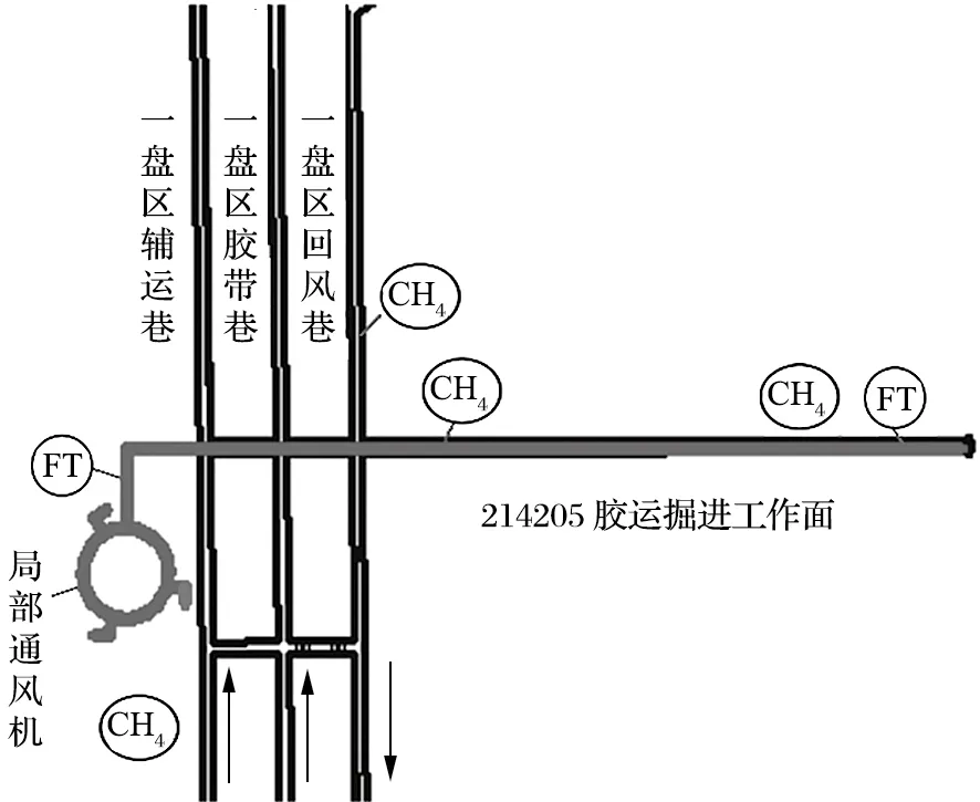 在掘進工作面新鮮風流進風側安裝有 2 臺變頻軸流式局部通風機,在巷道風門里正頭、專回口安裝有甲烷傳感器。對風筒安裝風壓傳感器,結合掘進期間實際瓦斯涌出量和濃度指標,系統自行計算供風量是否滿足風排瓦斯需求,通過變頻實現風量調節。掘進工作面優化布置如圖6 所示。