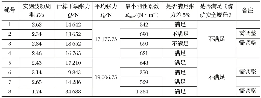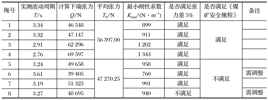 表4 振興二礦主井罐道繩張力測試結果