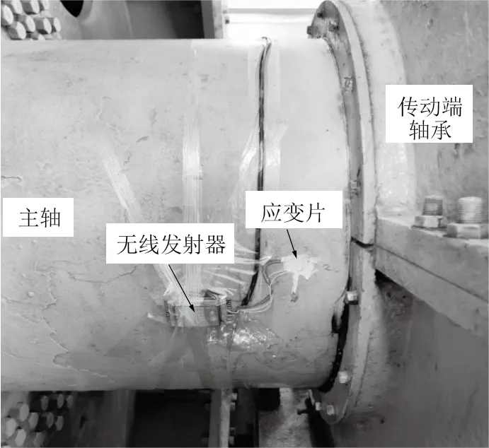 (3) 用膠水將應變片封住,用膠帶將無線發射器固定在主軸上,防止其在提升機轉動時被甩掉。應變片位置如圖3 所示。