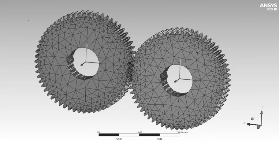 選用 ANSYS/Workbench 中的瞬態(tài)動力學(xué)模塊,對同步齒輪的嚙合過程繼續(xù)動態(tài)仿真分析。齒輪嚙合分析主要針對齒輪的接觸壓力以及zui大等效應(yīng)力特性。設(shè)置同步齒輪嚙合仿真時間為0.3s,選取28個齒面進(jìn)行14對接觸,接觸類型為摩擦接觸,摩擦因數(shù)為0.2,法向剛度系數(shù)為1。根據(jù)同步齒輪的運(yùn)動特性,確保齒輪只能繞 z 軸轉(zhuǎn)動。齒輪瞬態(tài)分析約束與載荷施加情況如圖8所示。