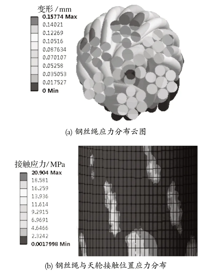 通過仿真結(jié)果可以看出,鋼絲繩的應(yīng)力集中在繩芯處,在 Pro/Engineer 中添加求解項(xiàng),計(jì)算鋼絲繩股內(nèi)的變形以及鋼絲繩和天輪接觸部位的應(yīng)力,可以得到如圖7 所示的計(jì)算結(jié)果。