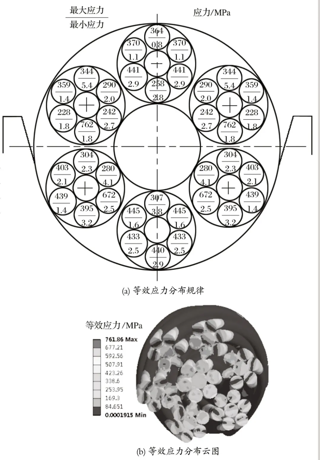 從圖6(a) 可以看出,鋼絲繩在受載作用時(shí),此時(shí)的等效應(yīng)力呈現(xiàn)出不均勻的分布形式,且存在層狀分布;鋼絲繩的應(yīng)力受到空間位置和相位變化的影響,在繩槽的中 心軸線上下部分分布不均勻;從圖6(b) 可以看到,鋼絲繩截面上應(yīng)力近似呈現(xiàn)對(duì)稱層狀分布,彈性區(qū)域和塑性區(qū)域相互交叉。鋼絲繩的外股層和接觸位置的應(yīng)力比其他同股的應(yīng)力較大,此時(shí)zui大值為 761.97 MPa,zui大應(yīng)力分布在靠近中 心軸軸線上半部分的左右兩側(cè)。鋼絲繩的交互捻外層股二次捻制鋼絲繩中,靠近繩芯的位置應(yīng)力比較大,zui大應(yīng)力是1 121.78 MPa,分布在繩槽中 心軸線上半部分。通過對(duì)比圖4 可以看出,zui大應(yīng)力主要集中在鋼絲繩的外側(cè),不同繩股層的鋼絲繩應(yīng)力值不同。
