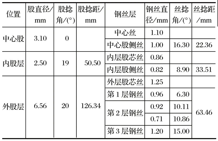 從表2 可以看出,鋼絲繩主要分為 3 層,中 心股、內(nèi)股和外股;3 股的直徑不同,并且股捻距也存在一定的差異。在進(jìn)行仿真求解時(shí),需要對(duì)各個(gè)層進(jìn)行定義。